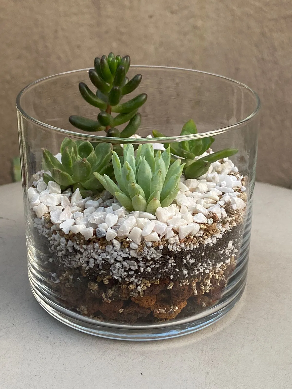 Este terrario cilíndrico de vidrio es tu pequeño jardín vivo, diseñado para los amantes de la naturaleza que buscan un toque de verdor en sus espacios de vida. El conjunto incluye variedades seleccionadas de suculentas como Echeveria, Sedum, y Crassula, cada una conocida por su belleza única y facilidad de cuidado. Colocado estratégicamente en lugares con luz indirecta y abundante, este terrario creará un ambiente tranquilo y fresco.