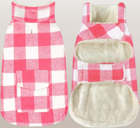 Diseño clásico de patrón a cuadros: nuestra ropa cálida para perro de estilo clásico a cuadros con forro polar proporciona una cobertura completa para tu mascota y aporta la máxima calidez y rango completo de movimiento. Con un diseño extra que toca como un bonito bolsillo trasero y agujero para correa en la parte posterior.