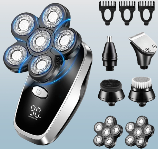 Kit de aseo 7 en 1: este juego de aseo todo en uno viene con una gama de accesorios intercambiables libremente como una afeitadora eléctrica dos cabezales de afeitado de repuesto un recortador de precisión un recortador de nariz y orejas peines límite (3/5/0.276 in) una esponja facial suave un cepillo de limpieza facial y un cable de carga USB. Puede satisfacer todas tus necesidades diarias.