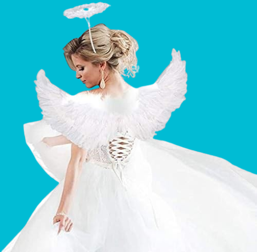 Ideal para disfraces y fiestas temáticas: alas de disfraz de ángel blanco y halo ideales para fiestas de disfraces y temáticas disfraz de alas de ángel de Halloween concurso de Navidad juego escolar accesorios de sesión de fotos o para vestir.