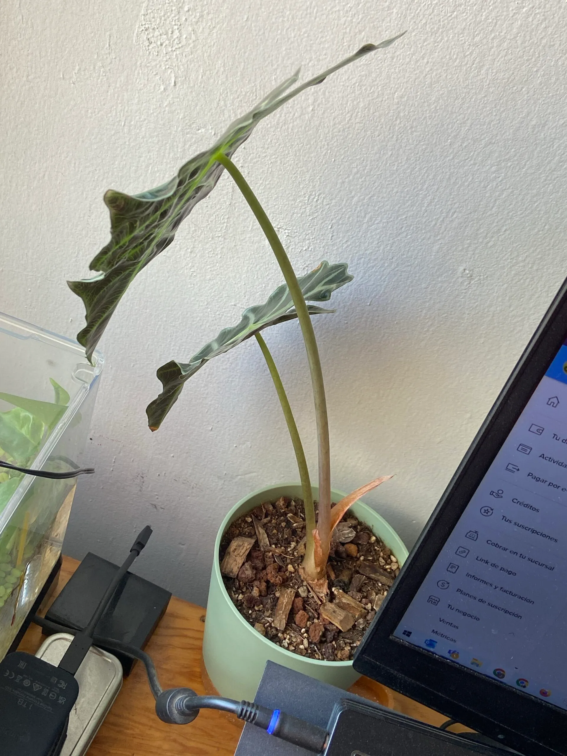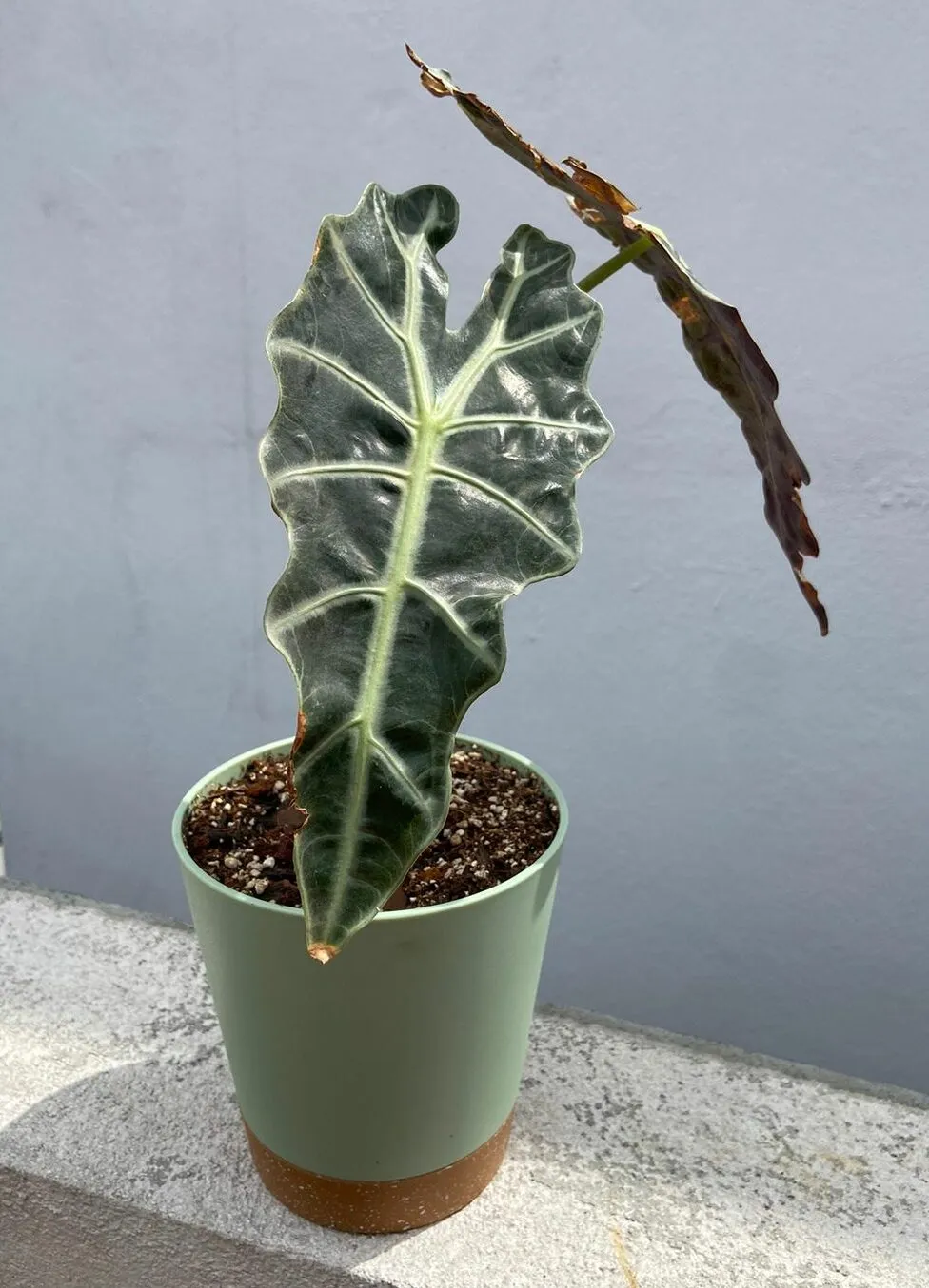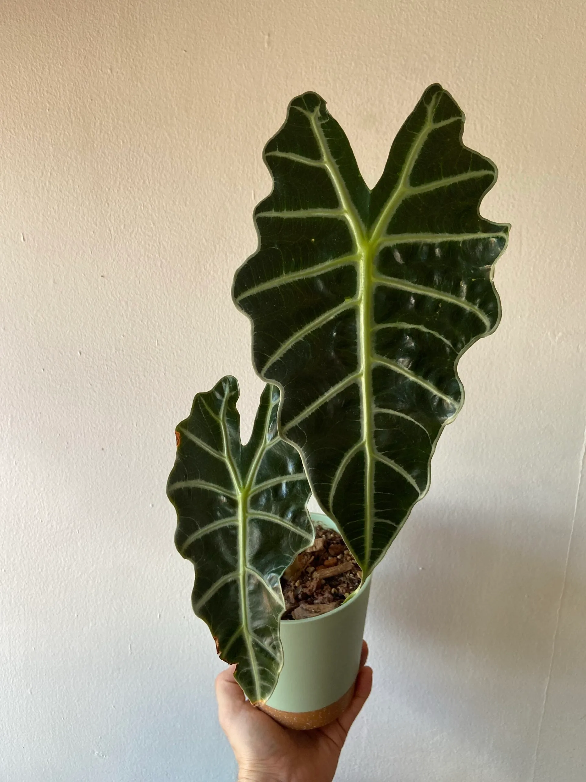 Alocasia máscara africana en maceta de plástico con autorriego color verde pistache