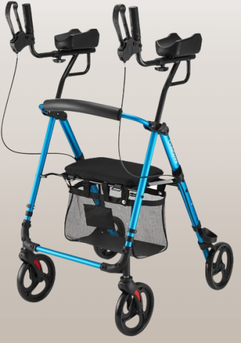 Diseño tradicional de andador vertical: muchas personas están acostumbradas a usar el andador tradicional por lo que el andador vertical azul claro OasisSpace se basa en él. El andador tradicional suele usar hierro lo cambiamos a aluminio. Hizo que el andador vertical con asiento sea un poco más ligero.