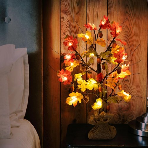 Arce de roble iluminado con 24 luces cálidas mejora la belleza de la noche en temporada de otoño. Hojas de roble natural con acabado de tronco marrón que crea una textura de corteza natural mientras que las bases estables aseguran que se mantengan erguidas.