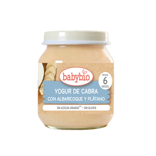 Yogur de albaricoque y plátano con leche de cabra. La leche de cabra tiene un sabor muy rico para los peques. Con ingredientes procedentes de la agricultura ecológica.