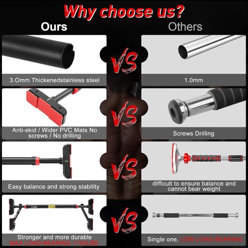 Diseño de marco de soporte: este es un increíble diseño nuevo que fortalece en gran medida la capacidad de carga de la barra de dominadas para que puedas estar más involucrado y más cómodo al hacer ejercicio. Cuando se monta correctamente esta barra de fitness puede soportar hasta 1100 libras (1102.3 lbs) lo que te da soporte completo para dominadas y dominadas.