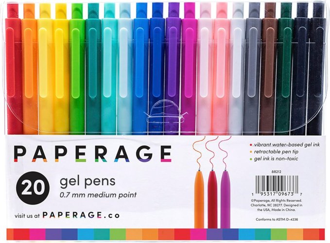Bolígrafos retráctiles de punta mediana: nuestro juego de bolígrafos de gel retráctiles está hecho con tinta de gel premium e incluye 20 colores únicos y vibrantes. La punta media produce una línea de 0.028 in y el barril suave al tacto es fácil de sostener. Cada bolígrafo se desliza fácilmente sobre el papel.