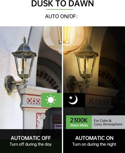 Encendido/apagado automático del atardecer al amanecer】No requiere aplicación no requiere control ni configuración manual con sensores fotocélula avanzados estas bombillas de detección de luz son fáciles de usar. Todo lo que necesita hacer es mantener el interruptor de encendido y dejarlos estar. Tenga la seguridad de que se iluminarán automáticamente al anochecer y se apagarán al amanecer ajustándose al brillo circundante. Nota: Estas bombillas no son regulables.