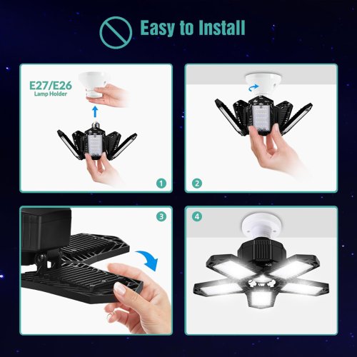 Fácil de instalar no requiere cableado: la luz de garaje es fácil de instalar equipada con base mediana estándar E26/E27 sin herramientas sin cableado y electricistas profesionales simplemente atornilla la bombilla de garaje en el soporte de lámpara ordinario pero más avanzada qu
