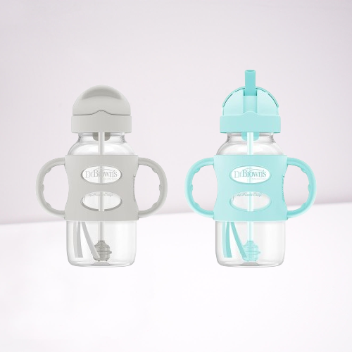 Se adapta a todas las botellas de cuello ancho del Dr. Brown. Tanto la tapa con popote como las asas de silicona se ajustan a Dr. Brown’s Options+ de cuello ancho de 9 oz/270 mL