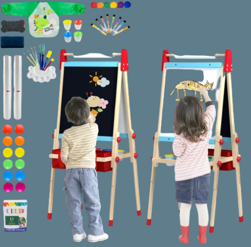 Juego de caballete para niños todo en uno: nuestro caballete de arte de madera para niños cuenta con una pizarra magnética blanca pizarra y 2 rollos de papel para permitir que los niños creen de varias maneras. También ofrecemos una gama completa de accesorios de pintura incluyendo 8 marcadores de colores 6 pinturas para dedos 12 fondos magnéticos redondos 4 macetas de pintura 2 pinceles de esponja 1 caja de tizas coloridas borrador seco letras y números magnéticos paletas pinceles y delantal.