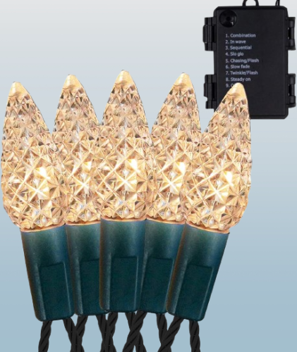 8 modos de iluminación y función de temporizador: la tira de luces de Navidad de Twinkle Star tiene 8 modos de iluminación para que elijas: combinación en ondas secuencial brillo lento persecución/flash desvanecimiento lento parpadeo/flash encendido constante. Ajuste los modos de iluminación presionando el botón redondo en la caja de la batería. Viene con función de temporizador automático integrada (6 horas encendido 18 horas apagado) para evitar olvidar apagar las luces de Navidad