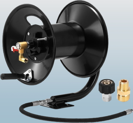 Especificaciones: el carrete de lavadora a presión es capaz de sostener 100 pies de manguera (no incluida) con un máximo PSI de 4000. Es compatible con extremo macho NPT de 3/8″ y extremo hembra M22.