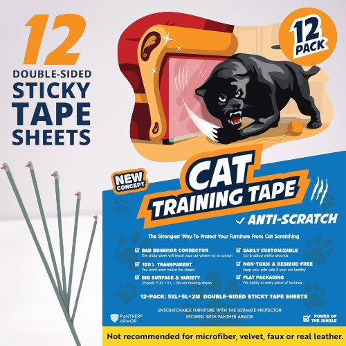 Entrena a tu gato al instante: la mejor cinta disuasiva de arañazos para gatos de doble cara es nueva en la ciudad y está lista para rodar. ¡Pero no hay rollo! Las láminas se empaquetan planas y se pueden plegar fácilmente en cualquier esquina. Las láminas adhesivas de la cinta anti-arañazos proporcionan una superficie de cubierta más que suficiente para evitar arañazos de los gatos. Entrenar a tu gato con Panther Armor puede ser la mejor inversión en la protección de tus muebles. La cinta anti-arañazos se puede aplicar en cualquier sofá tapizado silla puertas alfombras etc.