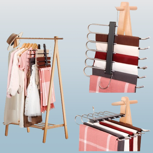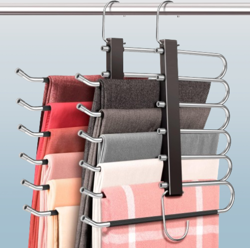 Es fácil colgar y retirar la ropa de estos colgadores. Gracias a nuestro diseño patentado de gancho que gira 360 grados colgar tu ropa o retirarla de nuestro colgador para varias prendas es muy sencillo. Este colgador para pantalones que se puede colocar en horizontal o en vertical está provisto de una capa antideslizamiento. Obtendrás 5 barras de donde colgar pantalones. Te ayudará a mantener tu ropa organizada.