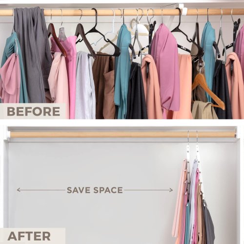 Organizador multiusos y que te ahorra espacio. Estos colgadores que incluyen varias perchas cada uno te permiten ahorrar espacio en el ropero y organizar mejor tu ropero. Este juego de dos colgadores con varias perchas cada uno se puede utilizar para colgar pantalones jeans faldas o bufandas y para organizar mejor tu ropero. Se trata de colgadores completos y multifuncionales.
