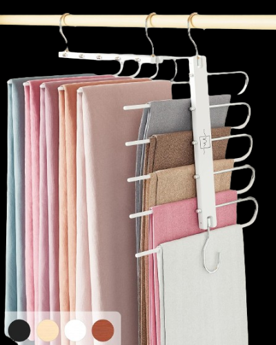 Diseño patentado con giro en 360 grados: gracias al gancho giratorio de 360 grados resulta más fácil colgar y descolgar muchos pantalones de este colgador con múltiples perchas. Este colgador para pantalones que se puede colocar en horizontal o en vertical es delgado y está provisto de una capa antideslizamiento. Obtendrás 5 barras de donde colgar pantalones. Te ayudará a mantener tu ropa organizada y segura en el ropero.