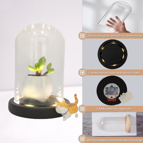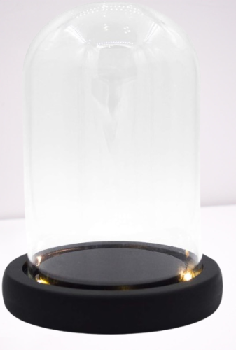 Tamaño de la base negra: la base es 0.79 pulgadas más ancha que el diámetro de la cúpula de vidrio y 0.79 pulgadas de grosor. La cúpula de vidrio es extraíble de la base.