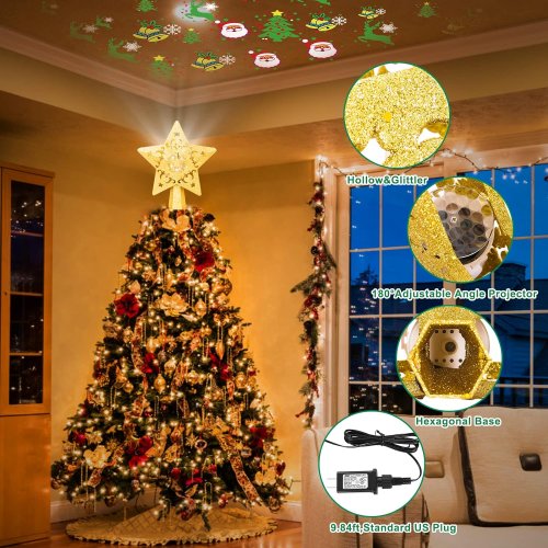 Decoración de árbol de Navidad: esta estrella para árbol de Navidad cuenta con un diseño hueco 3D con polvo dorado brillante. El cable de enchufe estándar de Estados Unidos de 9.84 pies también es suficiente para hacer que la decoración del árbol de estrella sea fácil de conectar añade luz brillante a tu árbol de Navidad haciendo que tu Navidad sea única.