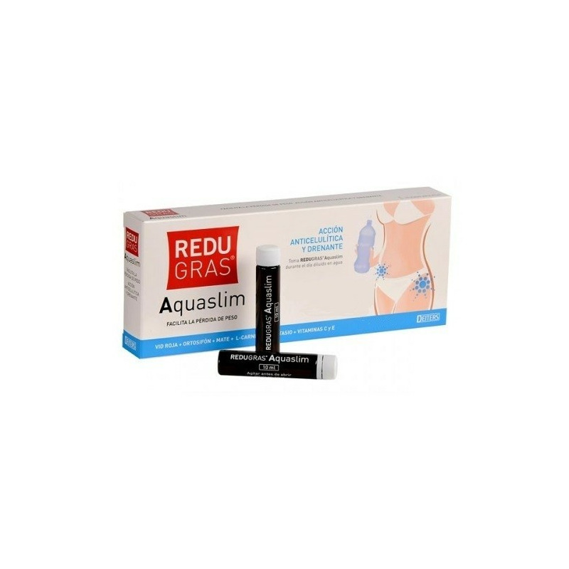 Redugras Aquaslim es un complemento alimenticio en forma de solución líquida para diluir en agua, en un formato de 20 viales. Está compuesto por extractos de vid roja, ortosifón, rusco, mate, L-carnitina, vitaminas C y E y potasio, y es el mejor método para perder peso gracias a sus dos acciones – ANTICELULITICA y DRENANTE.
