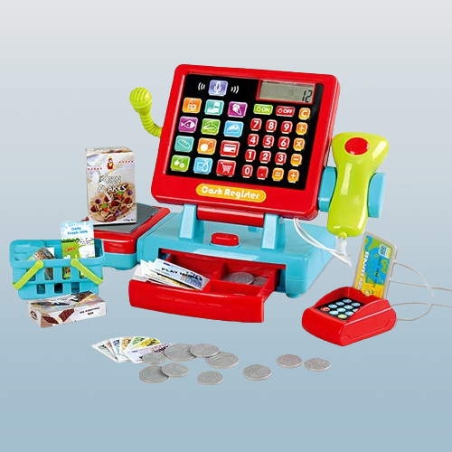 Construye una divertida tienda de juego: viene con ricos accesorios que incluyen dinero para jugar y monedas jugar tarjetas de crédito y juegos de comida (plato de comida hamburguesa sándwich papas fritas palomitas de maíz taza de bebida leche y cajas de galletas). Toma la comida de juego y paga dinero de apoyo y nuestra caja registradora de juguetes con sonidos ayudará a los niños a jugar al mejor cajero. Mejorará la imaginación y las habilidades sociales de los niños.