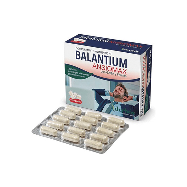 Balantium Ansiomax de Derbos es un complemento alimenticio con ácido fólico, GABA y extractos de plantas.