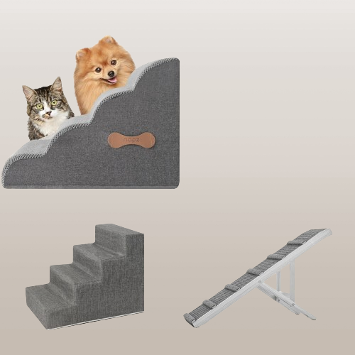 Diseño de escalón curvado de ángulo pequeño: Las escaleras de espuma para perros con escalones curvos y pequeños ángulos de paso ayudan a proteger las articulaciones de su mascota mientras les permiten llegar a lugares altos cómodamente. El diseño de paso de ángulo pequeño ayuda a eliminar la tensión de sus articulaciones especialmente para perros pequeños o mayores que pueden tener problemas de movilidad.