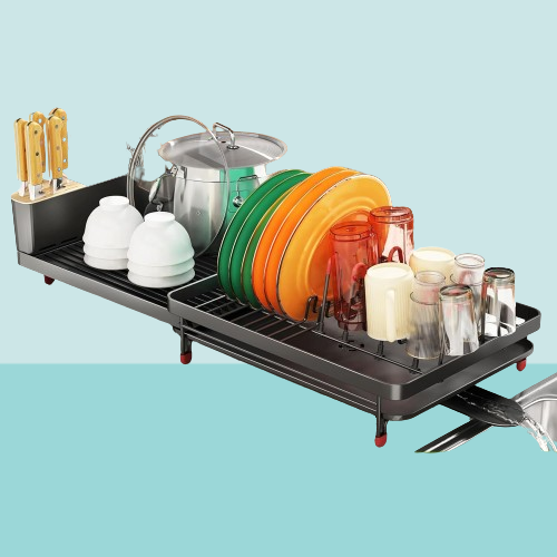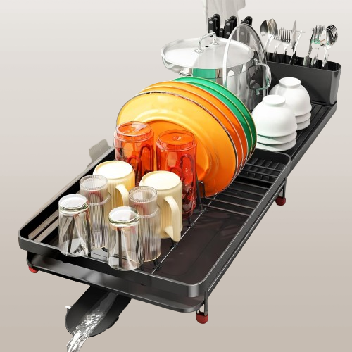 Diseño extensible: mide 12.8 pulgadas de ancho x 7.3 pulgadas de alto y de 19.1 a 26.9 pulgadas de largo el escurridor de platos de cocina SNTD se puede ajustar para adaptarse a diferentes cocinas para más espacio de secado cuando sea necesario.