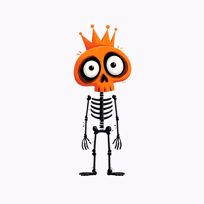 Este esqueleto naranja con su corona brillante es el rey de la diversión y la originalidad. Perfecto para niños y jóvenes que buscan un diseño unisex lleno de personalidad y alegría, que invita a vivir cada día con actitud y estilo. Ideal para expresar cr