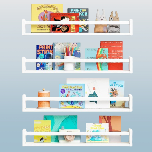 monta estos estantes flotantes de 23.6 pulgadas de largo en la pared de tu guardería los niños pueden guardar libros para colorear juguetes animales de peluche y juegos en estantes de pared donde estarán fuera del suelo y son fáciles de alcanzar.