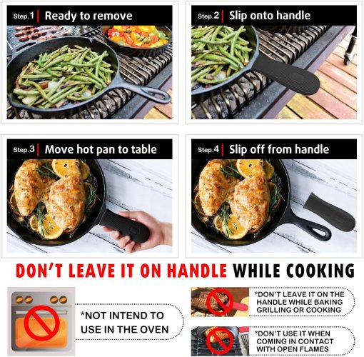 Esta funda de mango de hierro fundido tiene silicona ultra gruesa con agarre interior proporciona hasta 475 ℉ resistencia al calor. No tiene intención de utilizar en el horno. *No lo utilices cuando entres en contacto con llamas abiertas