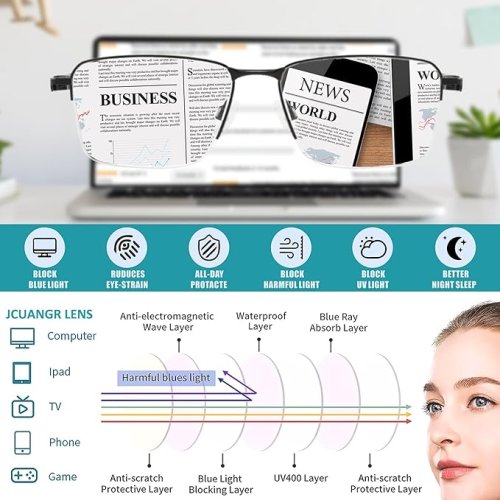 Se seleccionan gafas para miopes Jcuangr con transparencia HD propiedades impermeables resistentes al desgaste fáciles de limpiar y resistentes a las manchas. Basándose en la ley de rotación del ojo se calcula científicamente una curvatura mediante un ordenador para garantizar que la curvatura de la lente sea adecuada y que las gafas para miopes resulten cómodas al conducir o trabajar con el ordenador. Las gafas para hipermetropía también pueden practicar deportes como correr andar en bicicleta hacer senderismo pescar y otros deportes. permitiéndole disfrutar de una vista clara.Lentes de gafas de distancia con bloqueo de luz azul actualizadas: el revestimiento antiluz azul de las gafas para miopía en la superficie de la lente puede proteger la luz azul en la vida diaria como la luz solar (UV400) el semáforo mientras se conduce y las pantallas electrónicas (TV computadora rayos X etc.) La alta tasa de transmisión de luz del 98% y el material iluminador súper resistente hacen que su visión sea más clara y ayudan a mantener sus anteojos en buenas condiciones durante un largo período de tiempo y brindan protección contra la luz azul durante todo el día.Montura Hlaf ligera cómoda e irrompible: las gafas de diseño Jcuangr XL extra anchas y elegantes para visión a distancia para hombre tienen un material duradero respetuoso con el seco bisagra flexible de resorte cómodo de llevar y se adapta a la mayoría de las formas de cara de hombres y mujeres. incluyendo una gran cabeza grande y una cara pequeña. Las lentes de anteojos sin receta para miopes con luz azul para computadora son irrompibles y tienen un marco clásico rectangular resistente a los rasguños. Todo esto le brinda una experiencia de uso agradable.