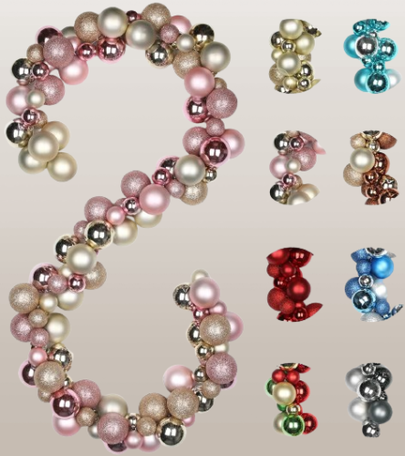 Características del producto: una apariencia sobresaliente de la guirnalda de bolas de Navidad la disposición irregular de 129 bolas de colores muestra que más única puedes colocarla en cualquier forma. Hay 3 colores dos tamaños y 3 tipos de bolas incluidas: bolas brillantes bolas mate y bolas de purpurina. Con 15 estilos diferentes de adornos de Navidad para elegir.