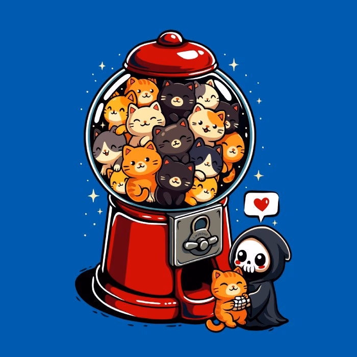 Embrace a darkly whimsical vibe with this striking and playful design: a retro gumball machine overflowing with tiny, mischievous cats, while a grim reaper playfully reaches for one of them! This cartoon-style illustration combines vibrant colors, quirky