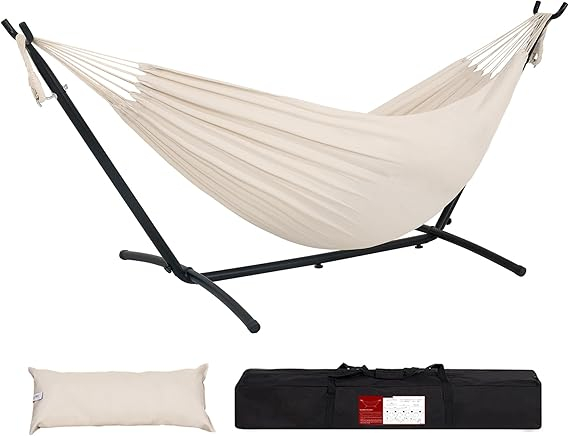 - Lazy Daze Hammock Combo, la hamaca doble resistente a la intemperie está hecha de algodón estrechamente tejido, suave y súper cómoda. El paquete viene con marco de acero duradero y bolsa de transporte para un fácil almacenamiento
