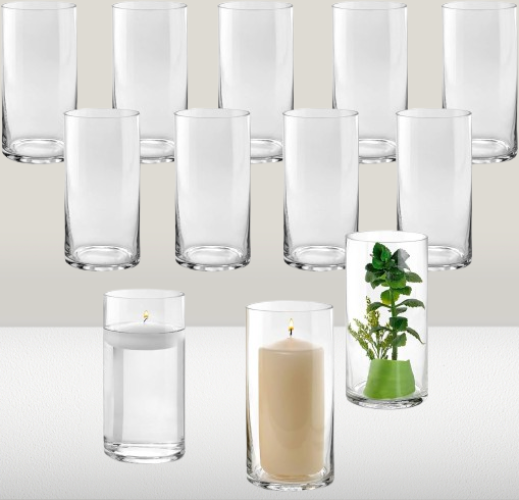 El juego incluye 12 jarrones de cristal de 8 pulgadas de alto con apertura de 4 pulgadas en la parte superior. IMPORTANTE: Flores o velas no están incluidas.