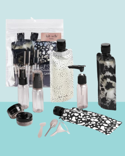 Juego de viaje de 11 piezas. El juego de viaje de Kitsch es un elemento esencial para las escapadas. Incluido en tu juego de 11 piezas: Tres (3) bolsas planas exprimibles un (1) mini frasco pulverizador dos (2) frascos con bomba dos (2) mini tarros con tapas resellables un (1) embudo una (1) espátula y una (1) pipeta sellados en una bolsa reutilizable.