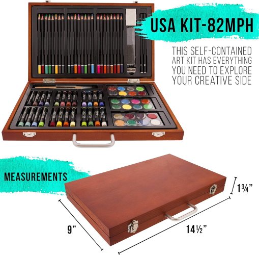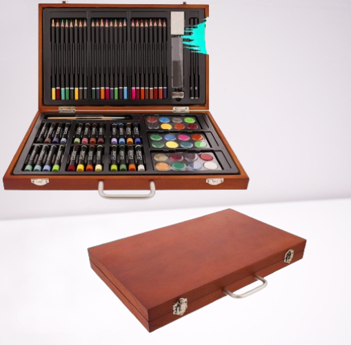El juego de dibujo de caja de madera de 82 piezas incluye: 24 lápices de colores 24 pasteles al óleo 24 pasteles de acuarela 3 bandejas de mezcla 2 lápices de dibujo 2 pinceles sacapuntas regla borrador