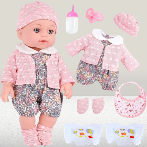 El juego incluye: muñeca de bebé de 12 pulgadas 1 juego de ropa de muñeca de bebé una serie de accesorios para muñecas de bebé como sombrero chupete botella de leche babero 2 pañales.