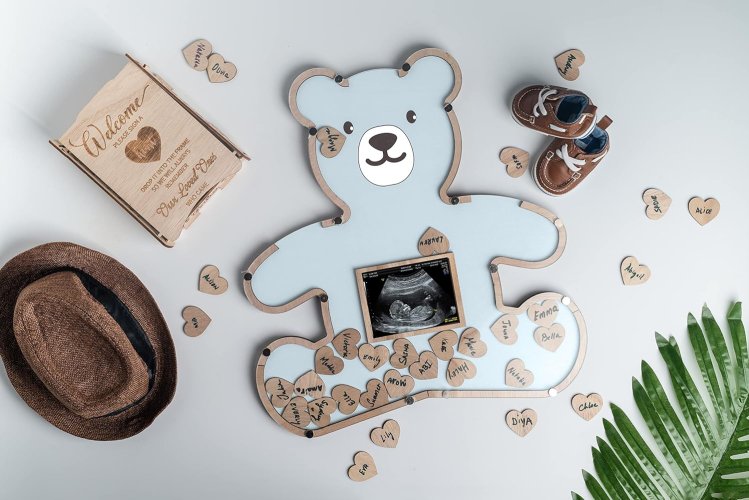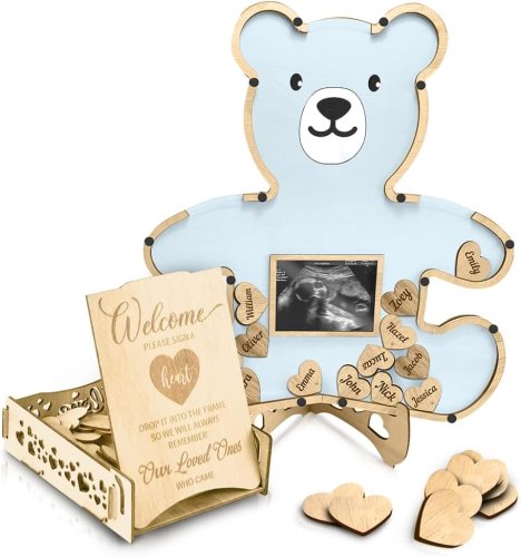 Permite a los invitados dejar buenos deseos consejos y palabras de sabiduría: esta decoración de oso de peluche para baby shower funciona como un juego o actividad de baby shower lo que permite a los invitados tomar turnos dejando sus buenos deseos consejos para padres y firmas en la caja de sombra del libro de invitados.