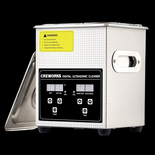 Este limpiador ultrasónico industrial Creworks utiliza 60W de potencia para llenar su lavabo de 0.5 galones con burbujas de cavitación utilizando la fuerza de sus pequeñas implosiones para limpiar a fondo y profesionalmente superficies incluso pequeñas e intrincadas .Hasta 50W de calefacción permite una acción aún más potente.
