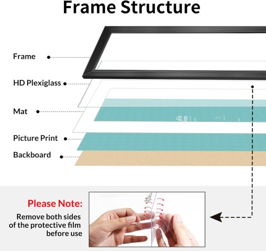 El paquete incluye: juego de 2 marcos en acabado negro con tinte de madera se adapta a imágenes estándar de 18 x 18 pulgadas fotos impresiones con plexiglás. Este panel de plexiglás está cubierto con una película protectora en ambos lados después de retirarlo ambos lados quedarán muy claros. Recuerda arrancarlos.