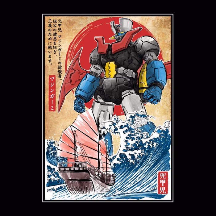 Diseño de Mazinger Z en ukiyo-e con la gran ola de kanagawa