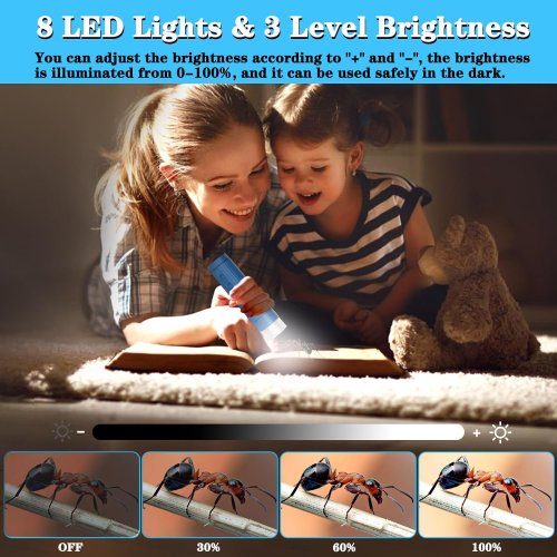 8 luces LED ajustables: ocho luces LED ajustables están integradas en el microscopio inalámbrico para proporcionar una iluminación adecuada en tres niveles de brillo. Puedes utilizar fácilmente el botón de atenuación para controlar el brillo de oscuro a claro. Con un detalle superior y una nitidez óptima las imágenes y videos de los usuarios pueden mejorar la calidad de la nitidez. Las luces LED irradiadas por un difusor son suaves y no asustan al sujeto que se está observando.
