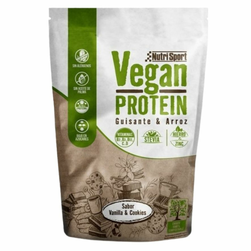Protein Guisante y Arroz Sabor Vainilla Vegan de Nutri-Sport es un complemento alimenticio ideal para aquellas personas que desean incluir una proteína de origen vegetal completa (arroz y guisante). Está especialmente diseñada para el sector vegetariano, añadiendo diferentes vitaminas y minerales, como hierro, vitamina D, y vitamina B12, entre otros.