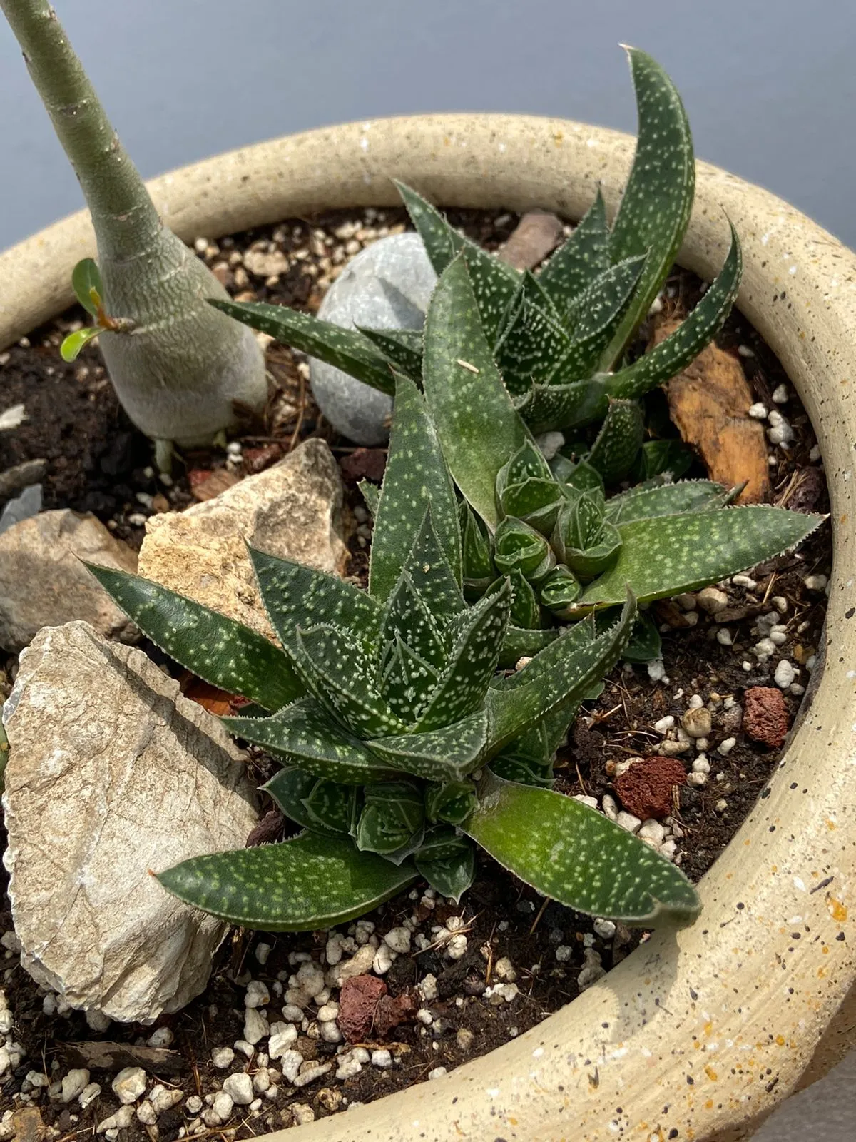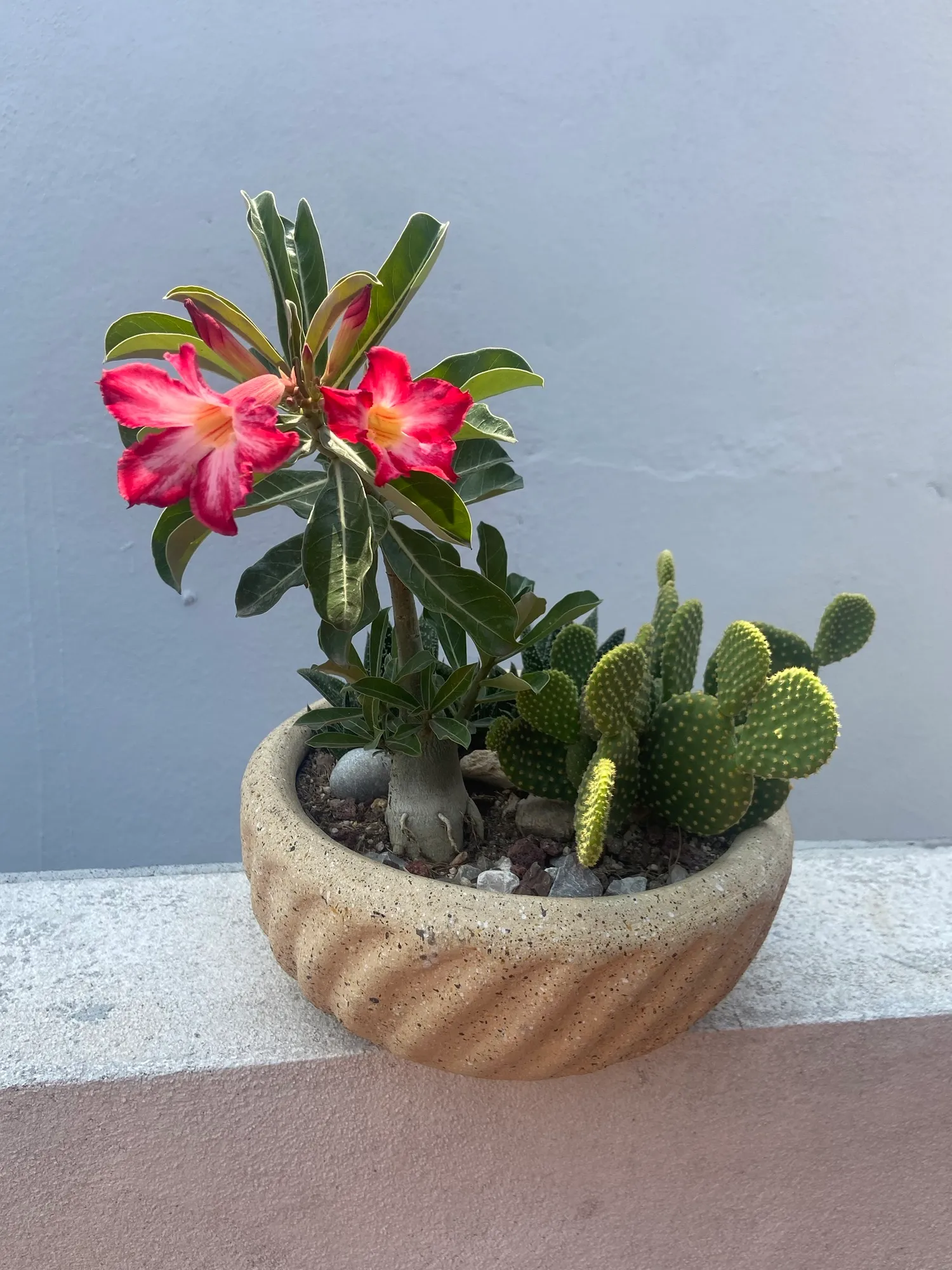 - Rosa del Desierto: Con su robusto tronco y brillantes hojas, añade un elemento visual único y florece bellamente bajo el sol.