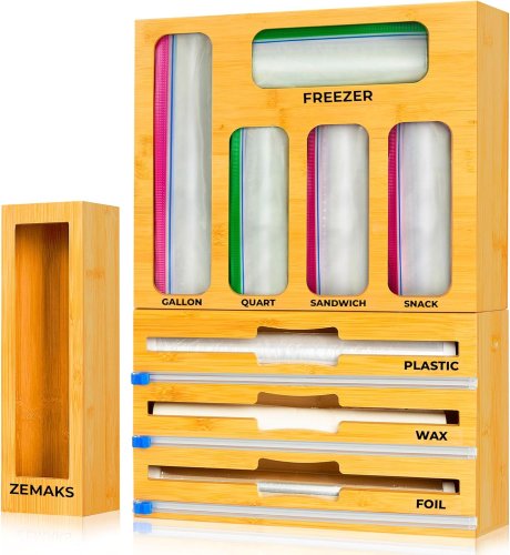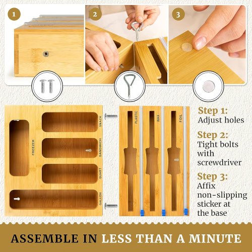 Producto es compatible con las marcas más populares como Ziplock Solimo Hefty Glad Up&Up y GreatValue. Es muy fácil de almacenar y organizar tus bolsas de congelador, galón, cuarto de galón, sándwich ,bolsas de aperitivos y tus rollos de cera papel de aluminio y plástico.