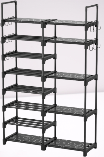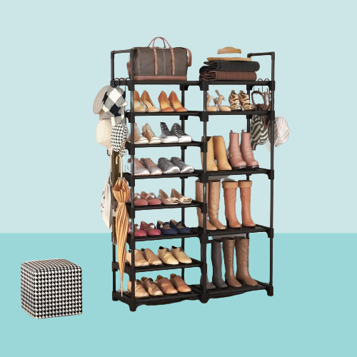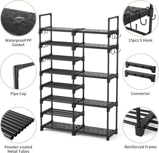 Zapatero de 8 niveles de gran espacio: con dimensiones de 33.4 pulgadas de ancho x 12 pulgadas de profundidad x 57 pulgadas de alto el estante grande para zapatos puede acomodar 26-32 pares de zapatos con facilidad. Con un diseño de diferente altura el organizador de zapatos se adapta perfectamente a botas tacones altos cajas de zapatos bolsas u otros accesorios más grandes satisfaciendo tus diversas demandas de almacenamiento. Viene con 15 ganchos versátiles es conveniente para colgar tus llaves paraguas bolsos sombreros etc.