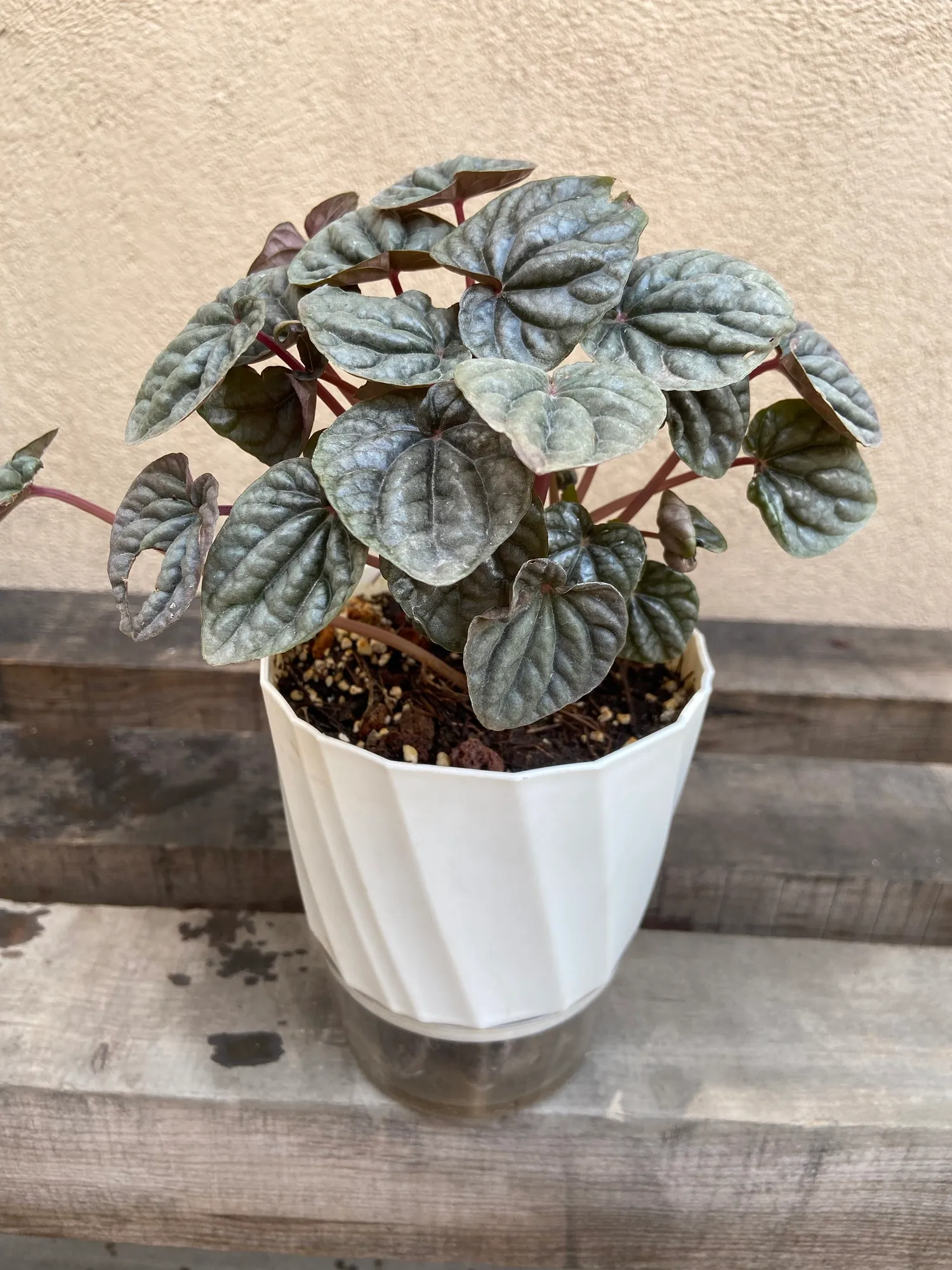 Descubre la belleza y el fácil mantenimiento de la Peperomia Caperata, también conocida como Peperomia Cascara de Nuez o Cola de Rata, en su práctica maceta de autorriego 🌿.