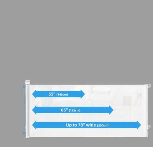 Esta puerta retráctil sin perforaciones está diseñada para ajustarse a un ancho de hasta 55 pulgadas (33 pulgadas de alto) se puede utilizar en las zonas interiores o exteriores. A diferencia de otras puertas esta puerta retráctil no tiene balaustrada en la parte inferior por lo que no hay peligro de tropiezo cuando te mueves con las manos llenas. A diferencia de otras puertas esta puerta retráctil para bebé se puede instalar rápidamente en 3 minutos sin necesidad de herramientas ni taladrar para proteger tu pared.