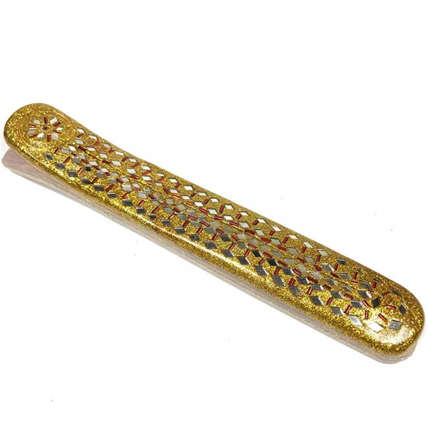 Es un Incensario largo, que puede soportar sticks. Es de madera, y está recubierto por pintura y textura lacada, con cristales de distintos colores. Son de gran variedad cromática, con un toque brillante de purpurina.